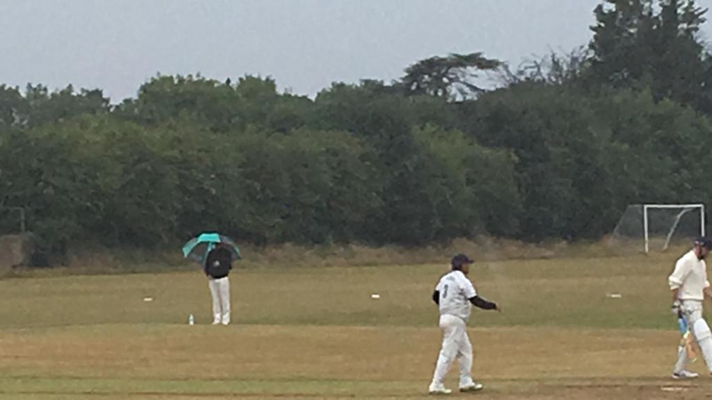Hill really turned the screw after the drinks break as Prem picked up a couple of wickets following some juggling at mid-off from Bhups and after Clare, whose ankles/shins seemed to be magnets for the ball, finally got one at a catchable height! A heavier shower meant taking an earlier tea break, but we quickly picked up the final 4 wickets after the 30 minute break in the slippier conditions, as Bhups blew through the tail and Stupples managed to bowl the only batsman to go beyond 20 through the gate.